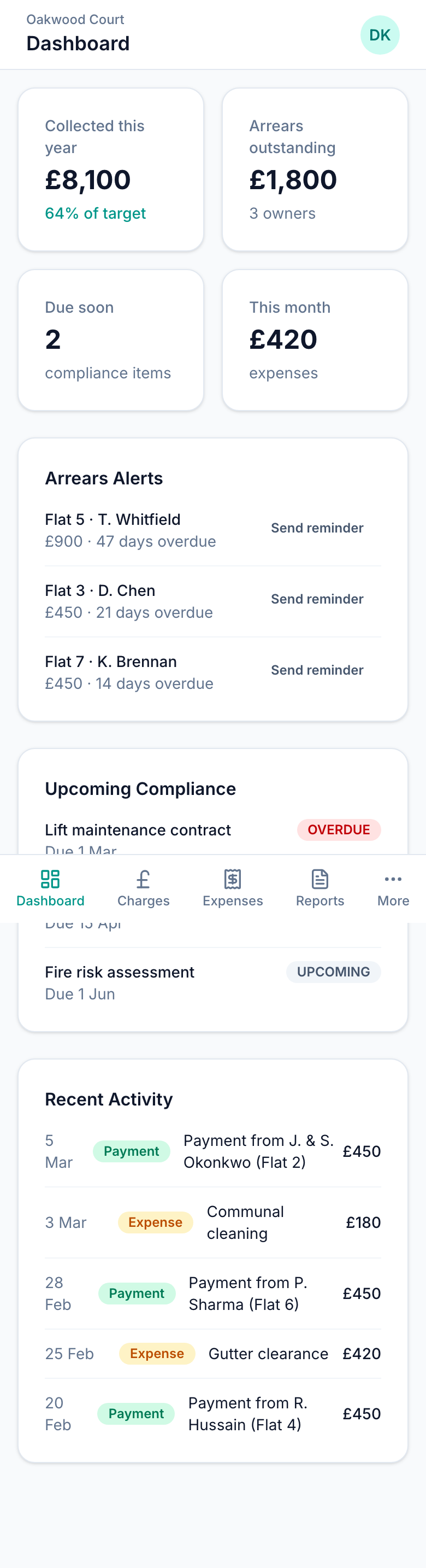 Built for volunteer RMC and RTM directors running smaller UK blocks (typically 5–25 flats), with practical workflows for records, service-charge admin, and accountant handoff.